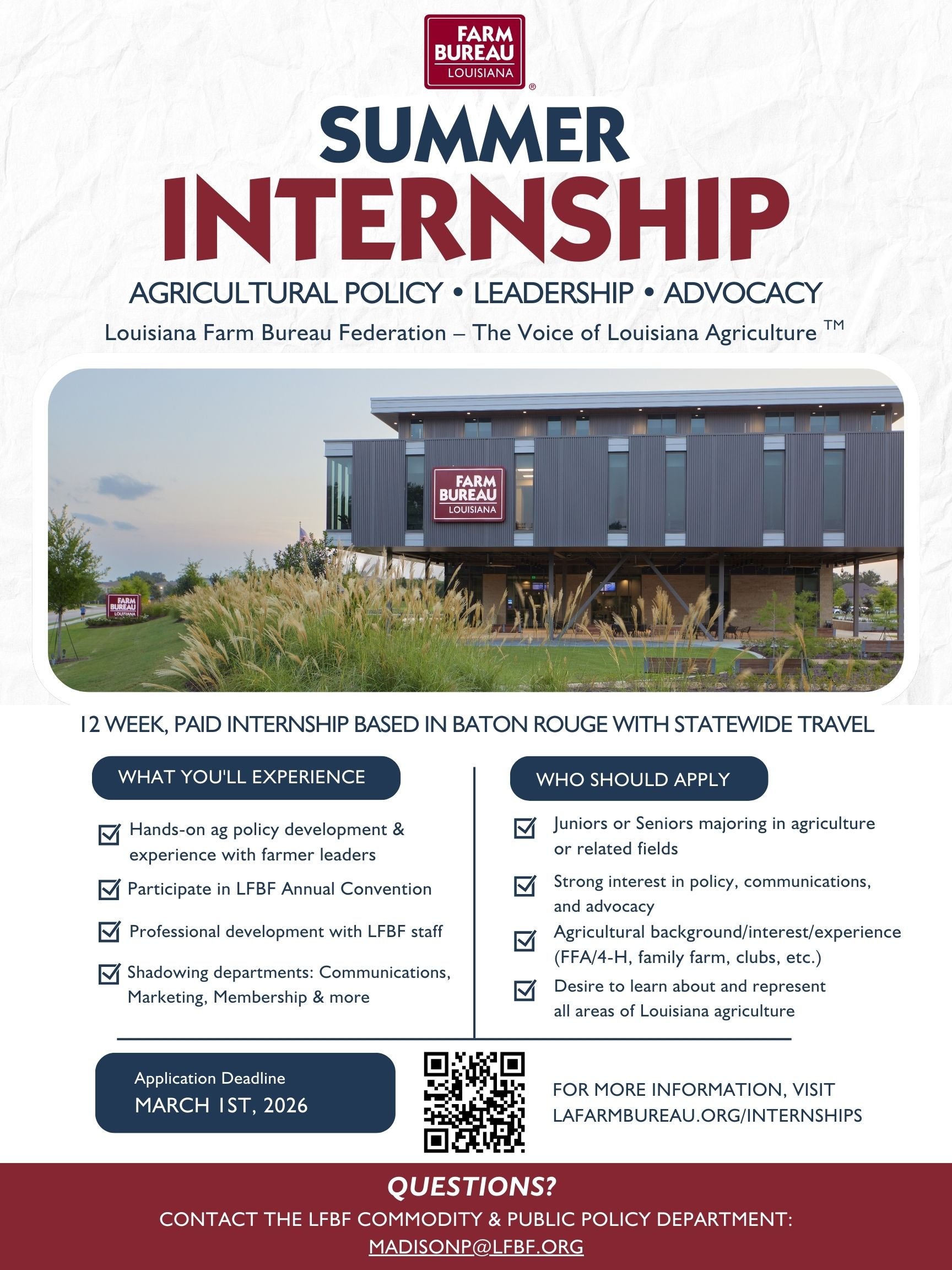 The Louisiana Farm Bureau Federation is now accepting applications for its paid, full-time Summer Internship focused on agricultural policy, leadership, and advocacy. Open to rising juniors, seniors, and graduate students, this mid-May through mid-August internship is based in Baton Rouge with statewide travel. The selected intern will gain hands-on experience working with farmer leaders, participate in the LFBF Annual Convention, engage in professional development, and complete a capstone-style project.